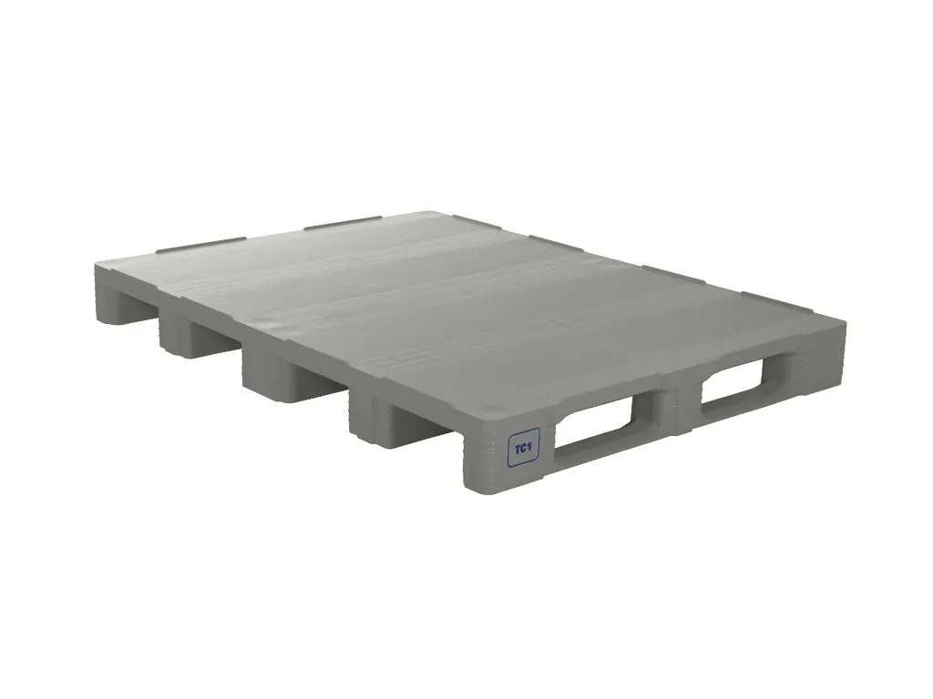 Kunststoff-Großformatpalette (1550 x 1200 x H 160 mm) Typ TC1-DUO - für Lebensmittel geeignet. Basierend auf zwei Paletten des Typs TC1, die dann nachhaltig verschweißt werden. Ausgestattet mit 5 längsverlaufenden Palettenkufen, geschlossenen Unterlageklötzen. Die obere und untere Palettenoberfläche des TC1-DUO ist komplett glatt und geschlossen ohne externe Rippenstrukturen, mit umlaufenden erhöhten Rändern (7 mm). Das statische Tragvermögen beträgt 7500 kg, das dynamische Tragvermögen beträgt 1500 kg. Maximale dynamische Belastung von 1500 kg bei gleichmäßig verteilter Last und mit breiter Gabelposition des Gabelstaplers. Verschiedene Organisationen verwenden DUO-Paletten mit voller Zufriedenheit.